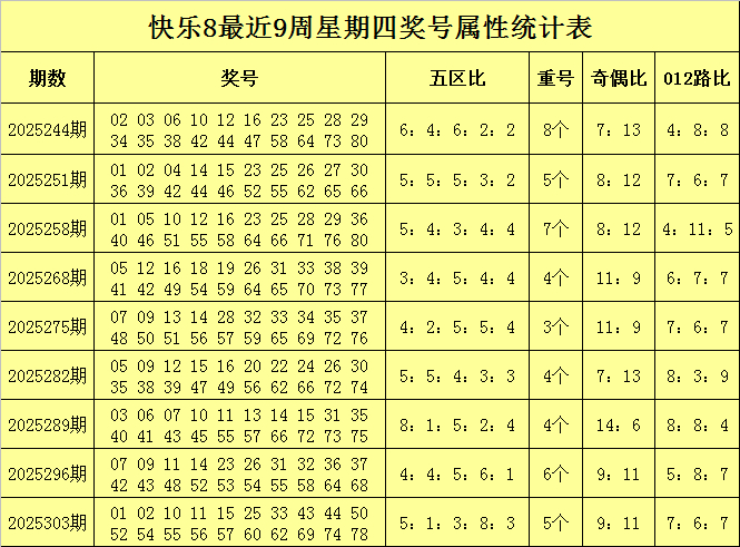 福彩快乐8第2025303期(上周四)奖号回顾:01 02 10 11 15 25 33 43 44 50 52 54 55 56 57 60 62 69 74 78,其中奖号奇偶比为9:11,五区比为5:1:3:8:3,012路比为7:6:7,包含5个重号11、43、52、54、55。